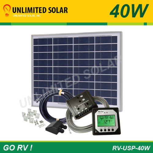 Unlimited Solar Go RV - RV Solar Panel Kits are the ideal solution for RVers, campers and travelers who are looking for a free source of energy.Unlimited Solar GO RV Solar Panel Kits are easy to install, operate completely on their own, and rarely need to be maintained over their lifetime.Now you can grab your own RV solar panel kit, install it, and be up and running in no time because all of our RV solar panel kits include everything you need to get started in one easy-to-install package.Unlimited Solar GO RV - 40 Watt RV Solar Power Kit includes a top quality 40W solar panel, a 10 Amp 12/24 Volt Dual Battery charge controller with Remote Screen, Flat roof mounting kit and 2 sets of PV Extension wires.